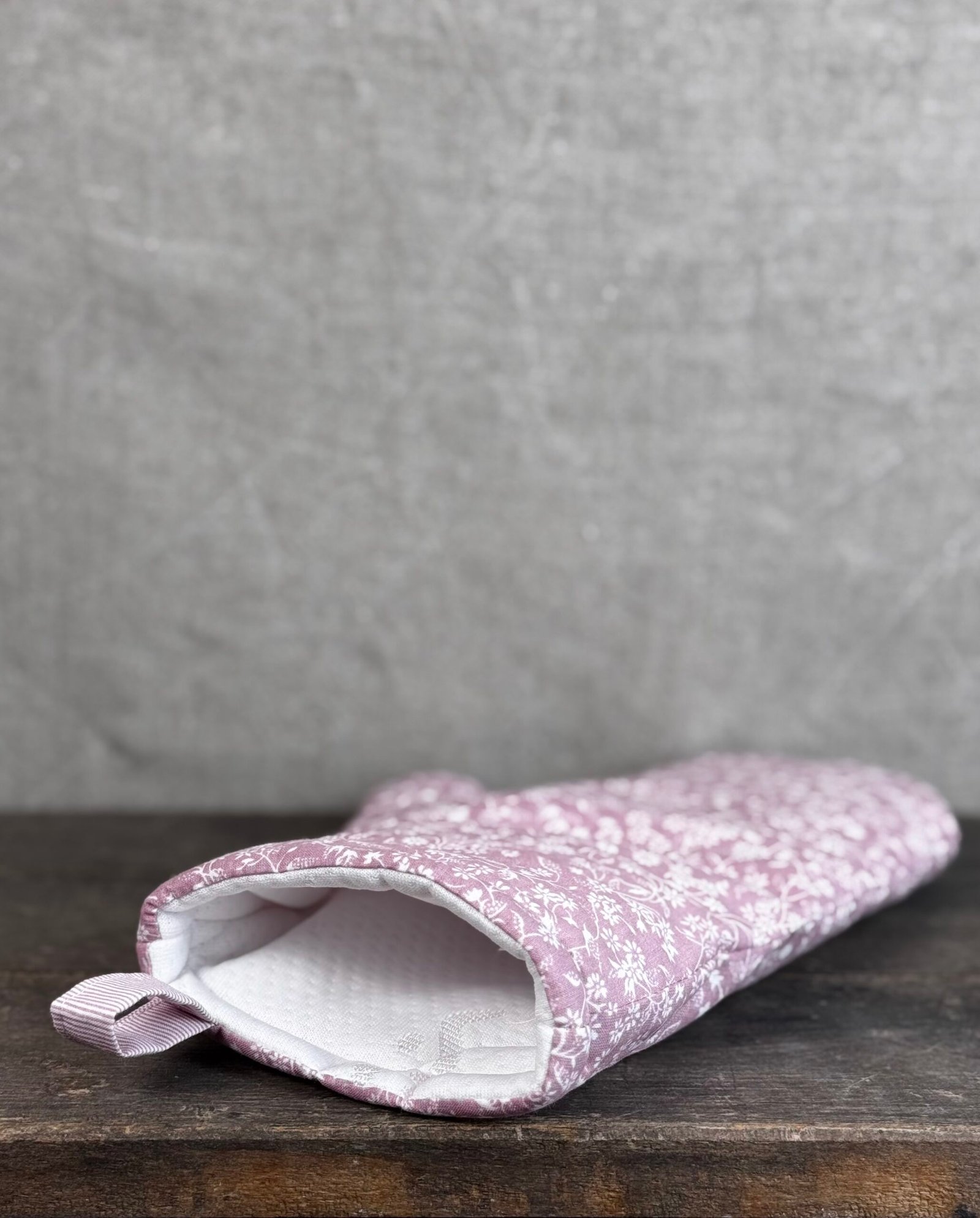 Růžová chňapka s jemným dekorem bílých květin rozzáří váš den a zpříjemní každé vaření.