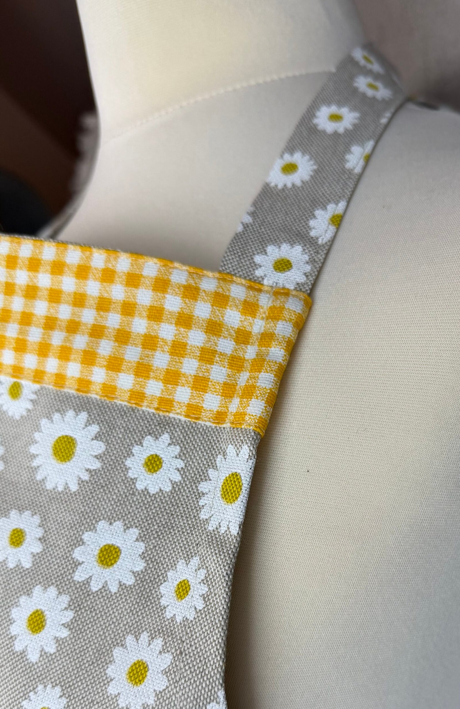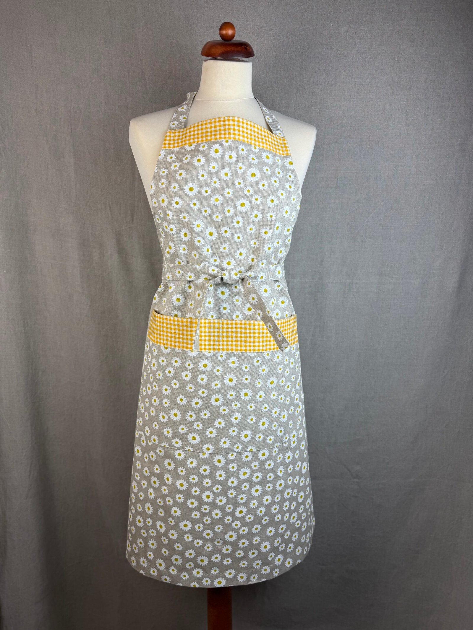 Máte rádi jarní kvítky? Tahle něžná zástěra s motivem bílých kopretin je právě pro vás! Žlutobílá kostka dodává zástěře jemný retro nádech, který krásně ladí s květinovým vzorem.
